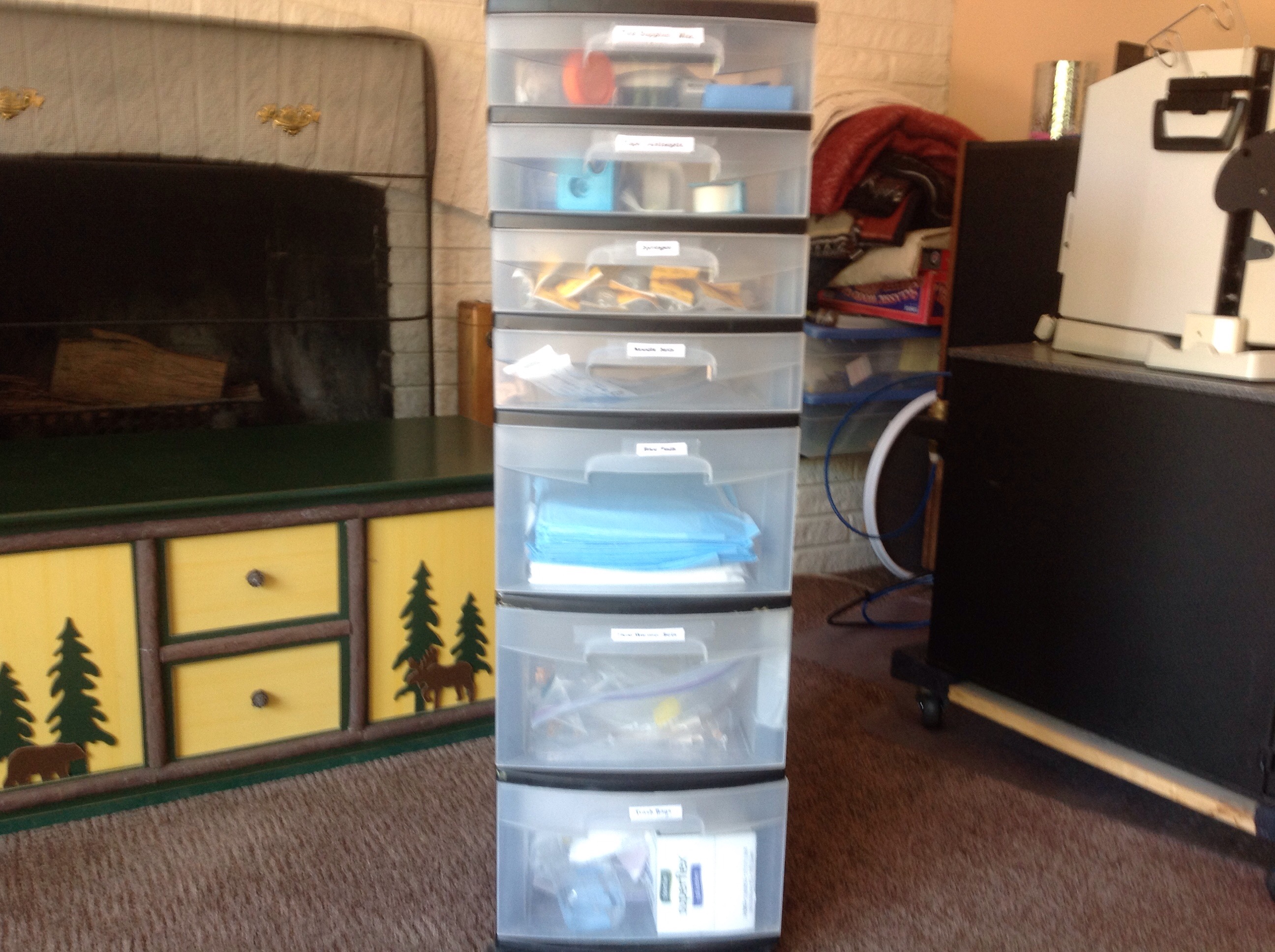 I use this cart when I dailize six times per week at home, and I put it in the back of our SUV when I travel. The picture is too small to read the tags on the drawers, but they are from top to bottom – Test Supplies/Misc, Tape Antiseptic, Syringes, Needle Sets, Blue Pads, Fluid Warmer Sets, and Trash Bags.